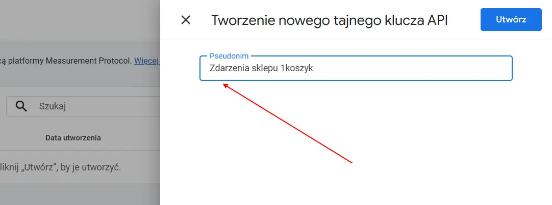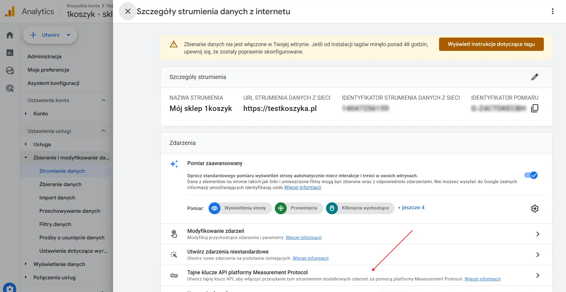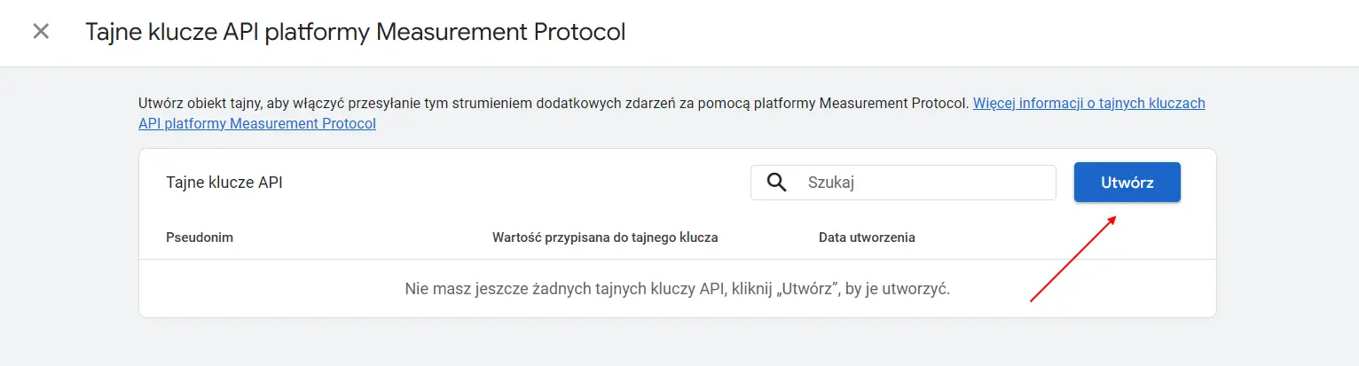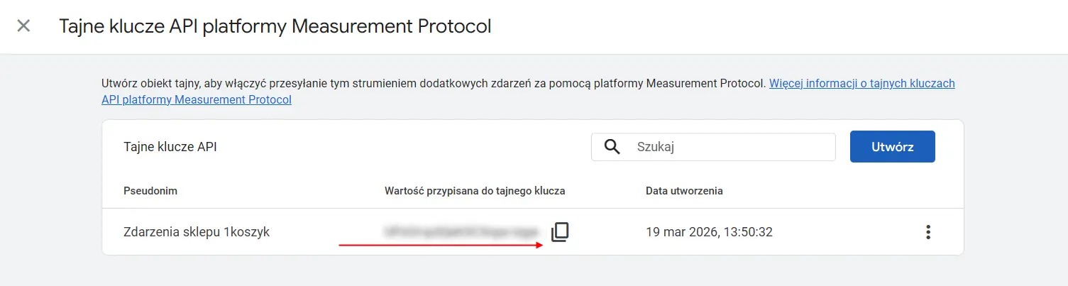 - Kliknij w zakłądkę "Tajne klucze API platformy Measurement Protocol"