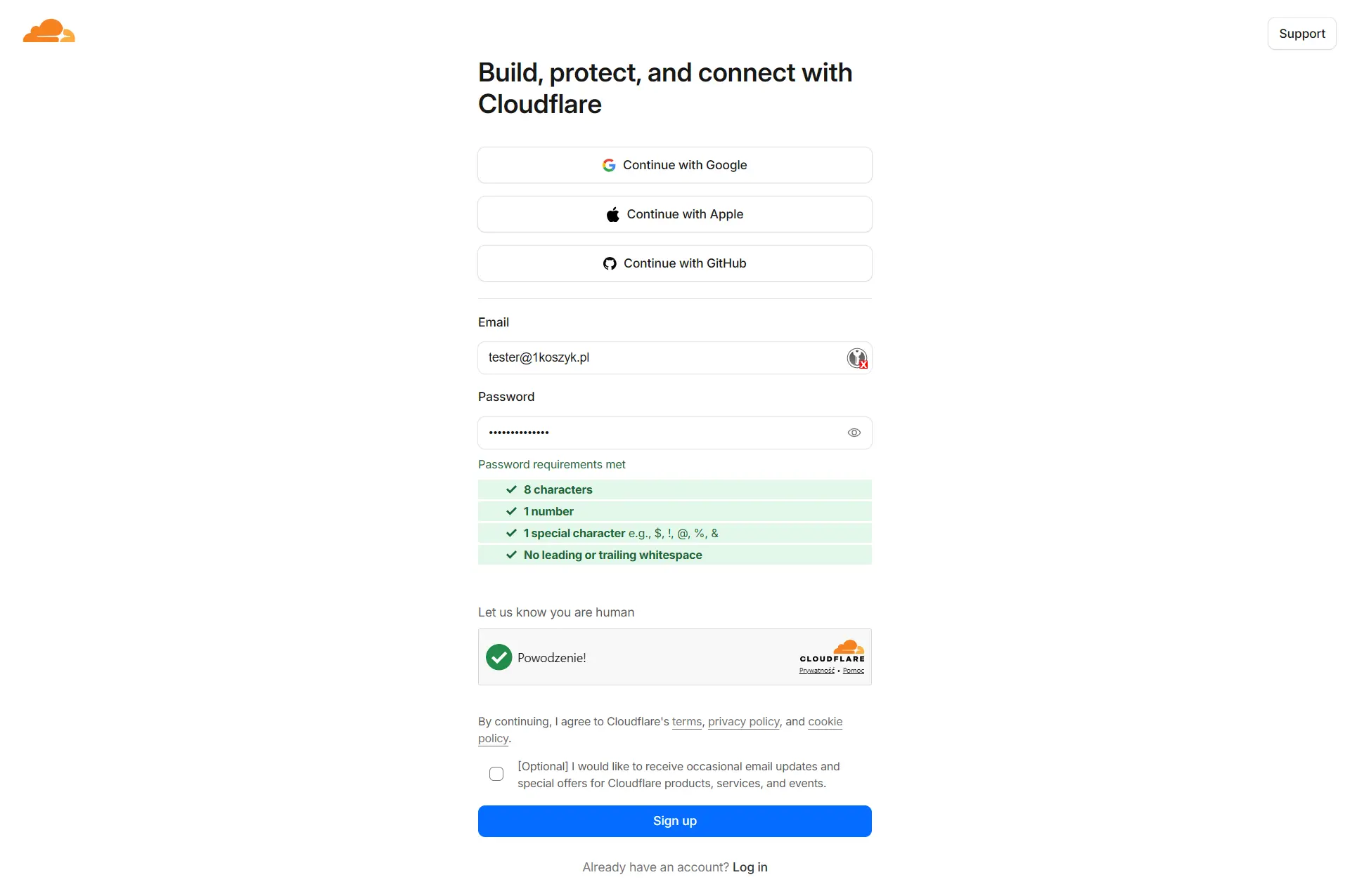 - Otwórz stronę https://dash.cloudflare.com/sign-up i utwórz konto wybierając jedną z dostępnych opcji.
