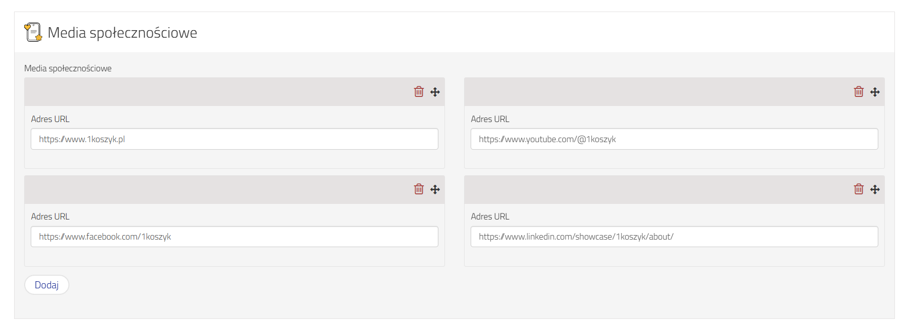 2. W sekcji "Media społecznościowe" przycisnąć "Dodaj" i podać pełny adres strony. W przypadku popularnych mediów społecznościowych system sam doda odpowiednią ikonkę.